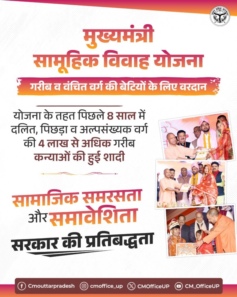 मुख्यमंत्री सामूहिक विवाह योजना उत्तर प्रदेश सरकार की एक संवेदनशील और सराहनीय पहल है, जिसका उद्देश्य आर्थिक रूप से कमजोर परिवारों की बेटियों का विवाह सम्मान, सरलता और सहयोग के साथ संपन्न कराना है। यह योजना न केवल आर्थिक सहायता देती है, बल्कि समाज में समानता और दहेज-मुक्त विवाह की सोच को भी मजबूती देती है।